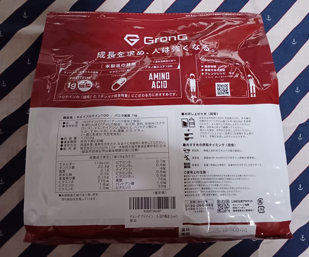 そこで今回はグロングのホエイプロテインを試そうとバニラ味1㎏を購入しました。因みに3㎏もあります。